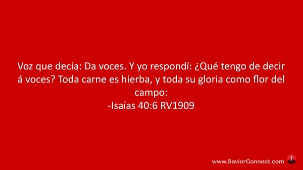 Voz que decía: Da voces. Y yo respondí: ¿Qué tengo de decir á voces? Toda carne es hierba, y toda su gloria como flor del campo: -Isaías 40:6 RV1909