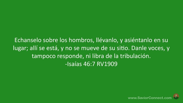 Echanselo sobre los hombros, llévanlo, y asiéntanlo en su lugar; allí se está, y no se mueve de su sitio. Danle voces, y tampoco responde, ni libra de la tribulación. -Isaías 46:7 RV1909