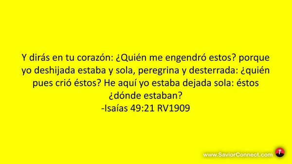 Y dirás en tu corazón: ¿Quién me engendró estos? porque yo deshijada estaba y sola, peregrina y desterrada: ¿quién pues crió éstos? He aquí yo estaba dejada sola: éstos ¿dónde estaban? -Isaías 49:21 RV1909