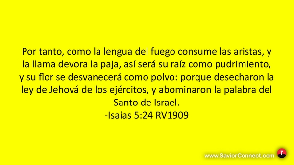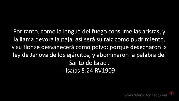 Por tanto, como la lengua del fuego consume las aristas, y la llama devora la paja, así será su raíz como pudrimiento, y su flor se desvanecerá como polvo: porque desecharon la ley de Jehová de los ejércitos, y abominaron la palabra del Santo de Israel. -Isaías 5:24 RV1909
