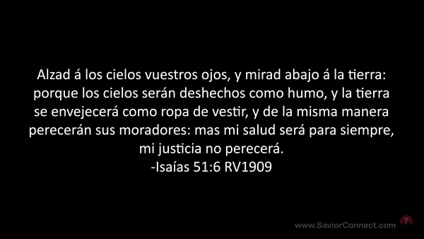 Alzad á los cielos vuestros ojos, y mirad abajo á la tierra: porque los cielos serán deshechos como humo, y la tierra se envejecerá como ropa de vestir, y de la misma manera perecerán sus moradores: mas mi salud será para siempre, mi justicia no perecerá. -Isaías 51:6 RV1909