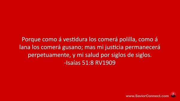 Porque como á vestidura los comerá polilla, como á lana los comerá gusano; mas mi justicia permanecerá perpetuamente, y mi salud por siglos de siglos. -Isaías 51:8 RV1909
