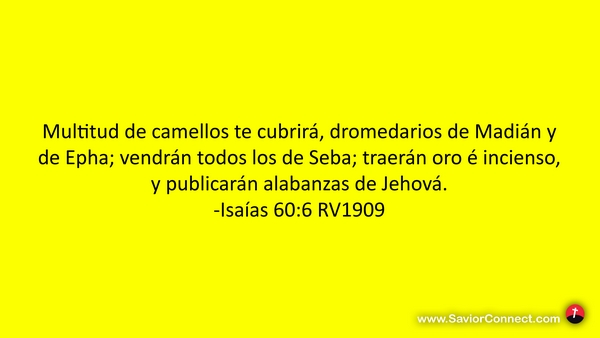 Multitud de camellos te cubrirá, dromedarios de Madián y de Epha; vendrán todos los de Seba; traerán oro é incienso, y publicarán alabanzas de Jehová. -Isaías 60:6 RV1909