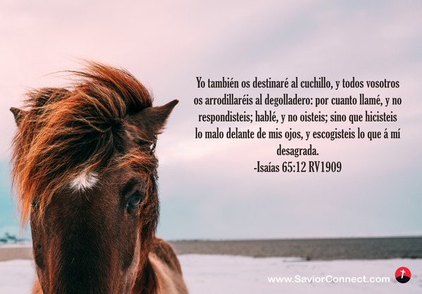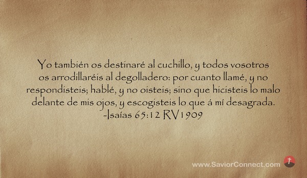Yo también os destinaré al cuchillo, y todos vosotros os arrodillaréis al degolladero: por cuanto llamé, y no respondisteis; hablé, y no oisteis; sino que hicisteis lo malo delante de mis ojos, y escogisteis lo que á mí desagrada. -Isaías 65:12 RV1909
