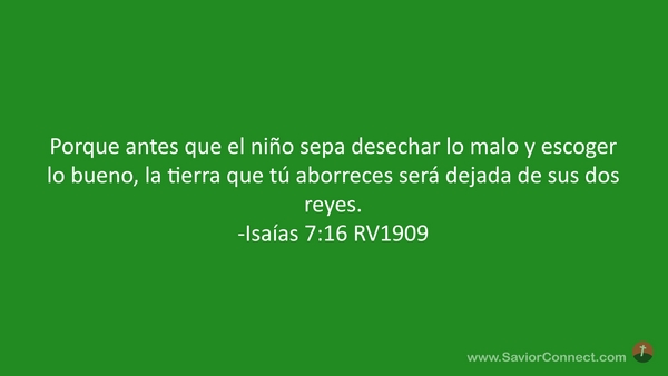 Porque antes que el niño sepa desechar lo malo y escoger lo bueno, la tierra que tú aborreces será dejada de sus dos reyes. -Isaías 7:16 RV1909