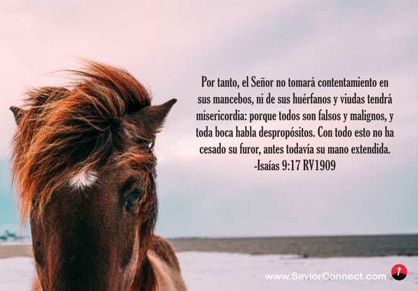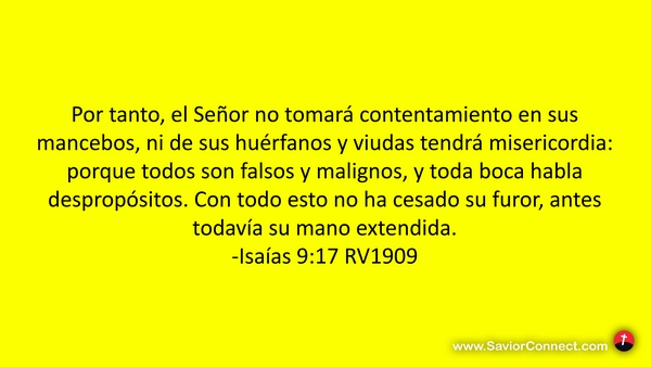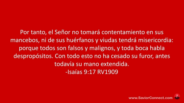 Por tanto, el Señor no tomará contentamiento en sus mancebos, ni de sus huérfanos y viudas tendrá misericordia: porque todos son falsos y malignos, y toda boca habla despropósitos. Con todo esto no ha cesado su furor, antes todavía su mano extendida. -Isaías 9:17 RV1909