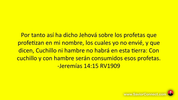 Por tanto así ha dicho Jehová sobre los profetas que profetizan en mi nombre, los cuales yo no envié, y que dicen, Cuchillo ni hambre no habrá en esta tierra: Con cuchillo y con hambre serán consumidos esos profetas. -Jeremías 14:15 RV1909