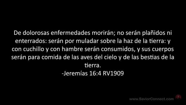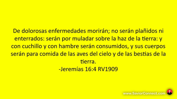 De dolorosas enfermedades morirán; no serán plañidos ni enterrados: serán por muladar sobre la haz de la tierra: y con cuchillo y con hambre serán consumidos, y sus cuerpos serán para comida de las aves del cielo y de las bestias de la tierra. -Jeremías 16:4 RV1909