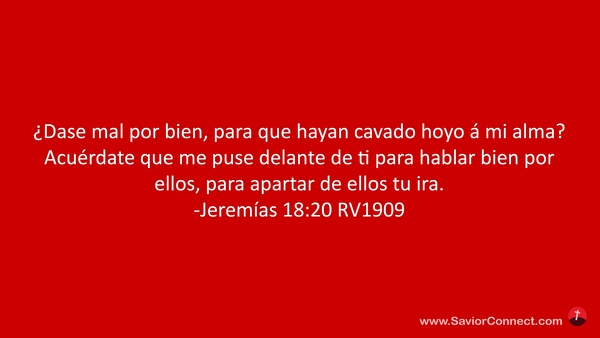 ¿Dase mal por bien, para que hayan cavado hoyo á mi alma? Acuérdate que me puse delante de ti para hablar bien por ellos, para apartar de ellos tu ira. -Jeremías 18:20 RV1909