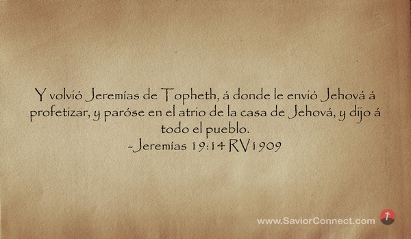 Y volvió Jeremías de Topheth, á donde le envió Jehová á profetizar, y paróse en el atrio de la casa de Jehová, y dijo á todo el pueblo. -Jeremías 19:14 RV1909