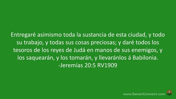 Entregaré asimismo toda la sustancia de esta ciudad, y todo su trabajo, y todas sus cosas preciosas; y daré todos los tesoros de los reyes de Judá en manos de sus enemigos, y los saquearán, y los tomarán, y llevaránlos á Babilonia. -Jeremías 20:5 RV1909