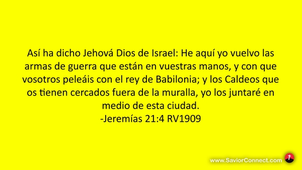 Así ha dicho Jehová Dios de Israel: He aquí yo vuelvo las armas de guerra que están en vuestras manos, y con que vosotros peleáis con el rey de Babilonia; y los Caldeos que os tienen cercados fuera de la muralla, yo los juntaré en medio de esta ciudad. -Jeremías 21:4 RV1909