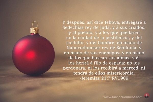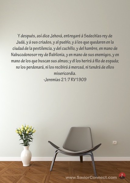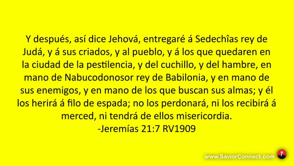 Y después, así dice Jehová, entregaré á Sedechîas rey de Judá, y á sus criados, y al pueblo, y á los que quedaren en la ciudad de la pestilencia, y del cuchillo, y del hambre, en mano de Nabucodonosor rey de Babilonia, y en mano de sus enemigos, y en mano de los que buscan sus almas; y él los herirá á filo de espada; no los perdonará, ni los recibirá á merced, ni tendrá de ellos misericordia. -Jeremías 21:7 RV1909