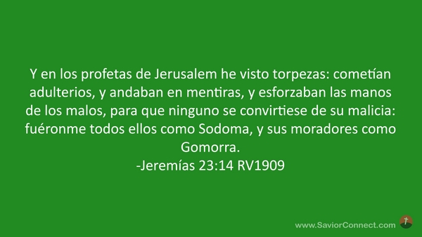 Y en los profetas de Jerusalem he visto torpezas: cometían adulterios, y andaban en mentiras, y esforzaban las manos de los malos, para que ninguno se convirtiese de su malicia: fuéronme todos ellos como Sodoma, y sus moradores como Gomorra. -Jeremías 23:14 RV1909