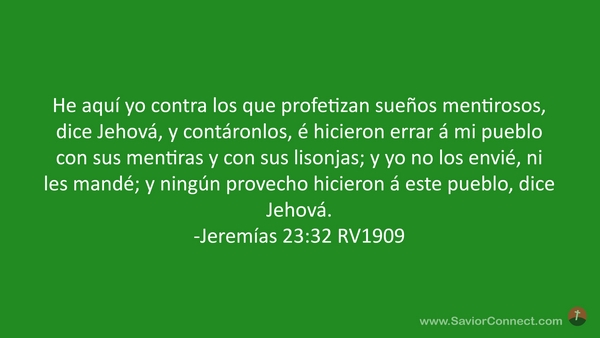 He aquí yo contra los que profetizan sueños mentirosos, dice Jehová, y contáronlos, é hicieron errar á mi pueblo con sus mentiras y con sus lisonjas; y yo no los envié, ni les mandé; y ningún provecho hicieron á este pueblo, dice Jehová. -Jeremías 23:32 RV1909