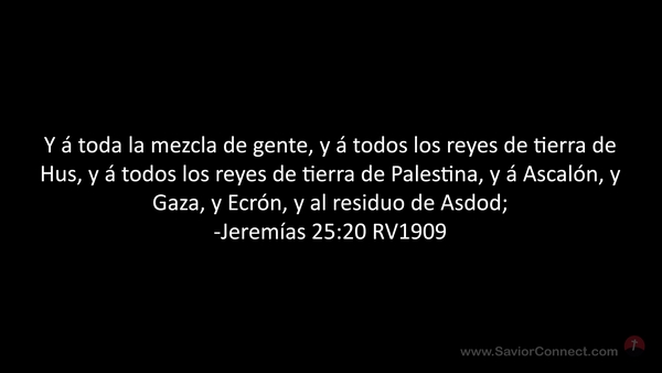 Y á toda la mezcla de gente, y á todos los reyes de tierra de Hus, y á todos los reyes de tierra de Palestina, y á Ascalón, y Gaza, y Ecrón, y al residuo de Asdod; -Jeremías 25:20 RV1909