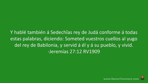 Y hablé también á Sedechîas rey de Judá conforme á todas estas palabras, diciendo: Someted vuestros cuellos al yugo del rey de Babilonia, y servid á él y á su pueblo, y vivid. -Jeremías 27:12 RV1909
