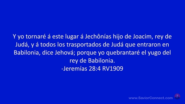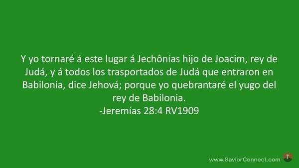 Y yo tornaré á este lugar á Jechônías hijo de Joacim, rey de Judá, y á todos los trasportados de Judá que entraron en Babilonia, dice Jehová; porque yo quebrantaré el yugo del rey de Babilonia. -Jeremías 28:4 RV1909