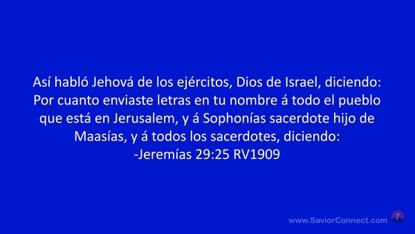 Así habló Jehová de los ejércitos, Dios de Israel, diciendo: Por cuanto enviaste letras en tu nombre á todo el pueblo que está en Jerusalem, y á Sophonías sacerdote hijo de Maasías, y á todos los sacerdotes, diciendo: -Jeremías 29:25 RV1909
