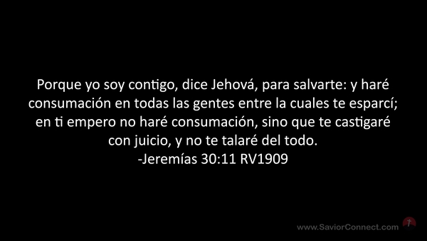 Porque yo soy contigo, dice Jehová, para salvarte: y haré consumación en todas las gentes entre la cuales te esparcí; en ti empero no haré consumación, sino que te castigaré con juicio, y no te talaré del todo. -Jeremías 30:11 RV1909