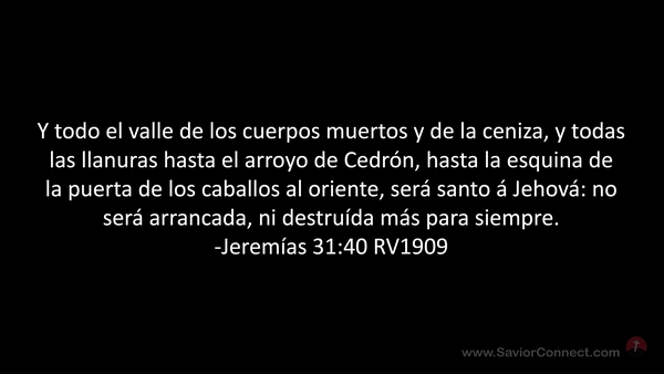 Y todo el valle de los cuerpos muertos y de la ceniza, y todas las llanuras hasta el arroyo de Cedrón, hasta la esquina de la puerta de los caballos al oriente, será santo á Jehová: no será arrancada, ni destruída más para siempre. -Jeremías 31:40 RV1909