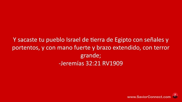 Y sacaste tu pueblo Israel de tierra de Egipto con señales y portentos, y con mano fuerte y brazo extendido, con terror grande; -Jeremías 32:21 RV1909