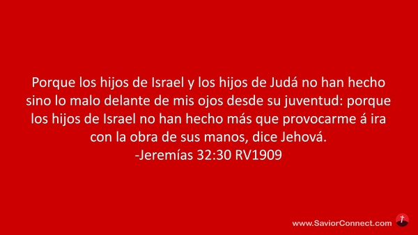 Porque los hijos de Israel y los hijos de Judá no han hecho sino lo malo delante de mis ojos desde su juventud: porque los hijos de Israel no han hecho más que provocarme á ira con la obra de sus manos, dice Jehová. -Jeremías 32:30 RV1909