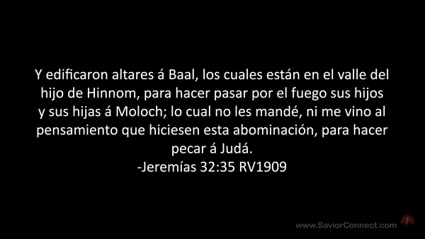 Y edificaron altares á Baal, los cuales están en el valle del hijo de Hinnom, para hacer pasar por el fuego sus hijos y sus hijas á Moloch; lo cual no les mandé, ni me vino al pensamiento que hiciesen esta abominación, para hacer pecar á Judá. -Jeremías 32:35 RV1909