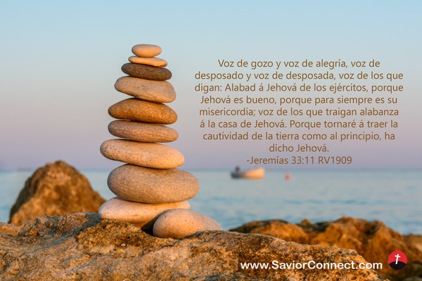 Voz de gozo y voz de alegría, voz de desposado y voz de desposada, voz de los que digan: Alabad á Jehová de los ejércitos, porque Jehová es bueno, porque para siempre es su misericordia; voz de los que traigan alabanza á la casa de Jehová. Porque tornaré á traer la cautividad de la tierra como al principio, ha dicho Jehová. -Jeremías 33:11 RV1909