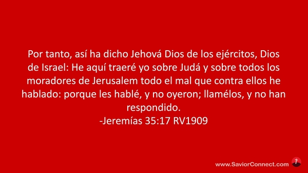 Por tanto, así ha dicho Jehová Dios de los ejércitos, Dios de Israel: He aquí traeré yo sobre Judá y sobre todos los moradores de Jerusalem todo el mal que contra ellos he hablado: porque les hablé, y no oyeron; llamélos, y no han respondido. -Jeremías 35:17 RV1909