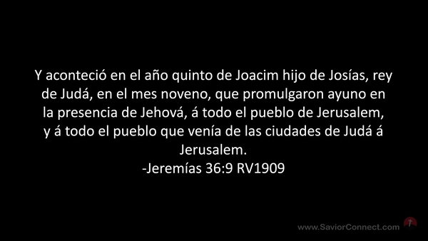Y aconteció en el año quinto de Joacim hijo de Josías, rey de Judá, en el mes noveno, que promulgaron ayuno en la presencia de Jehová, á todo el pueblo de Jerusalem, y á todo el pueblo que venía de las ciudades de Judá á Jerusalem. -Jeremías 36:9 RV1909