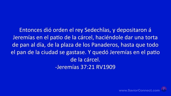 Entonces dió orden el rey Sedechîas, y depositaron á Jeremías en el patio de la cárcel, haciéndole dar una torta de pan al día, de la plaza de los Panaderos, hasta que todo el pan de la ciudad se gastase. Y quedó Jeremías en el patio de la cárcel. -Jeremías 37:21 RV1909