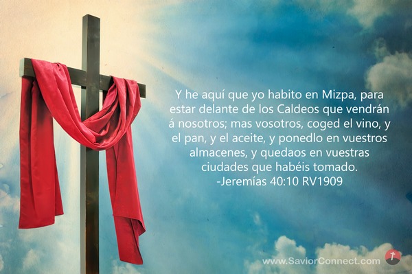 Y he aquí que yo habito en Mizpa, para estar delante de los Caldeos que vendrán á nosotros; mas vosotros, coged el vino, y el pan, y el aceite, y ponedlo en vuestros almacenes, y quedaos en vuestras ciudades que habéis tomado. -Jeremías 40:10 RV1909