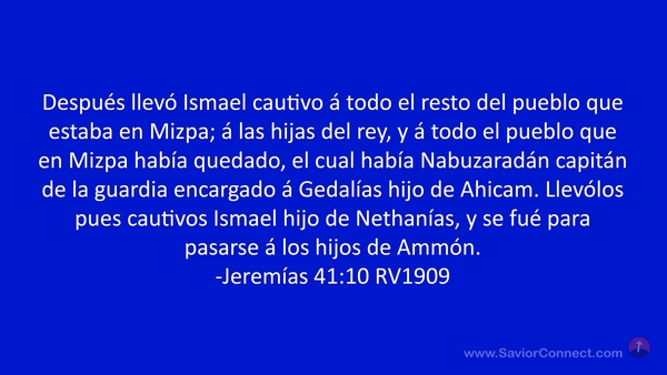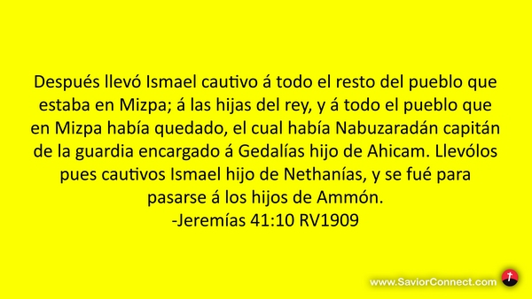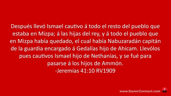 Después llevó Ismael cautivo á todo el resto del pueblo que estaba en Mizpa; á las hijas del rey, y á todo el pueblo que en Mizpa había quedado, el cual había Nabuzaradán capitán de la guardia encargado á Gedalías hijo de Ahicam. Llevólos pues cautivos Ismael hijo de Nethanías, y se fué para pasarse á los hijos de Ammón. -Jeremías 41:10 RV1909