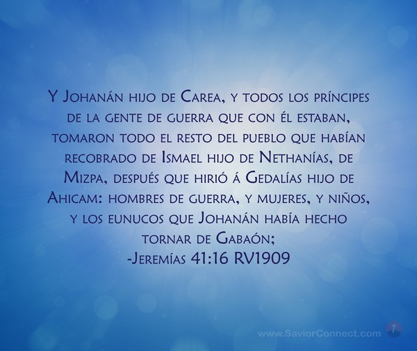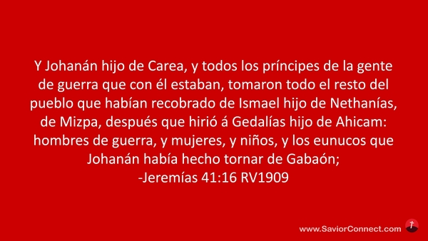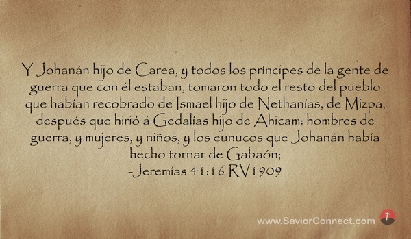Y Johanán hijo de Carea, y todos los príncipes de la gente de guerra que con él estaban, tomaron todo el resto del pueblo que habían recobrado de Ismael hijo de Nethanías, de Mizpa, después que hirió á Gedalías hijo de Ahicam: hombres de guerra, y mujeres, y niños, y los eunucos que Johanán había hecho tornar de Gabaón; -Jeremías 41:16 RV1909