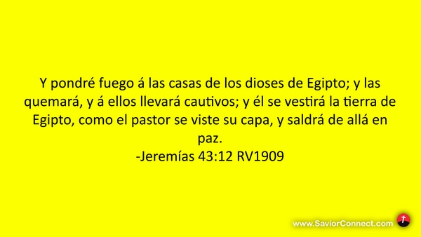 Y pondré fuego á las casas de los dioses de Egipto; y las quemará, y á ellos llevará cautivos; y él se vestirá la tierra de Egipto, como el pastor se viste su capa, y saldrá de allá en paz. -Jeremías 43:12 RV1909
