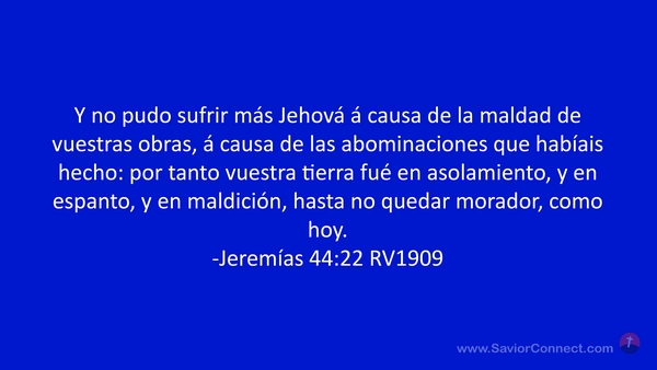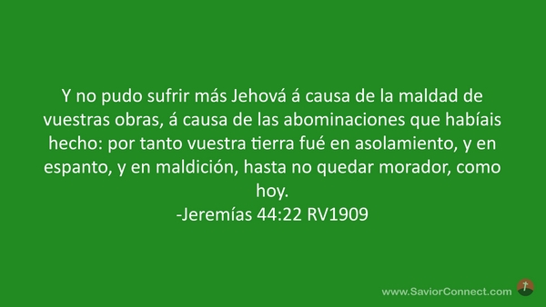 Y no pudo sufrir más Jehová á causa de la maldad de vuestras obras, á causa de las abominaciones que habíais hecho: por tanto vuestra tierra fué en asolamiento, y en espanto, y en maldición, hasta no quedar morador, como hoy. -Jeremías 44:22 RV1909