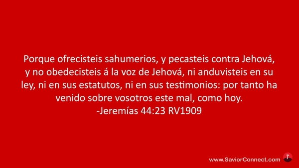 Porque ofrecisteis sahumerios, y pecasteis contra Jehová, y no obedecisteis á la voz de Jehová, ni anduvisteis en su ley, ni en sus estatutos, ni en sus testimonios: por tanto ha venido sobre vosotros este mal, como hoy. -Jeremías 44:23 RV1909