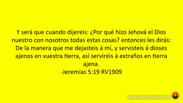 Y será que cuando dijereis: ¿Por qué hizo Jehová el Dios nuestro con nosotros todas estas cosas? entonces les dirás: De la manera que me dejasteis á mí, y servisteis á dioses ajenos en vuestra tierra, así serviréis á extraños en tierra ajena. -Jeremías 5:19 RV1909