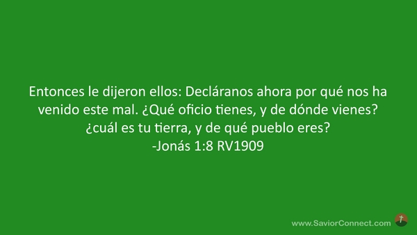Entonces le dijeron ellos: Decláranos ahora por qué nos ha venido este mal. ¿Qué oficio tienes, y de dónde vienes? ¿cuál es tu tierra, y de qué pueblo eres? -Jonás 1:8 RV1909
