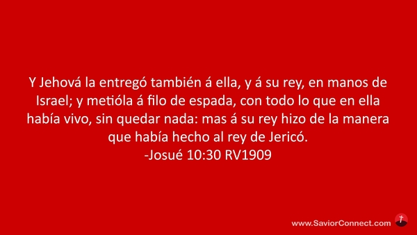 Y Jehová la entregó también á ella, y á su rey, en manos de Israel; y metióla á filo de espada, con todo lo que en ella había vivo, sin quedar nada: mas á su rey hizo de la manera que había hecho al rey de Jericó. -Josué 10:30 RV1909