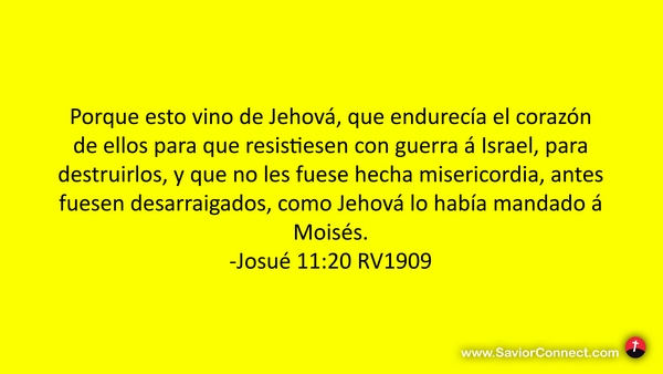 Porque esto vino de Jehová, que endurecía el corazón de ellos para que resistiesen con guerra á Israel, para destruirlos, y que no les fuese hecha misericordia, antes fuesen desarraigados, como Jehová lo había mandado á Moisés. -Josué 11:20 RV1909