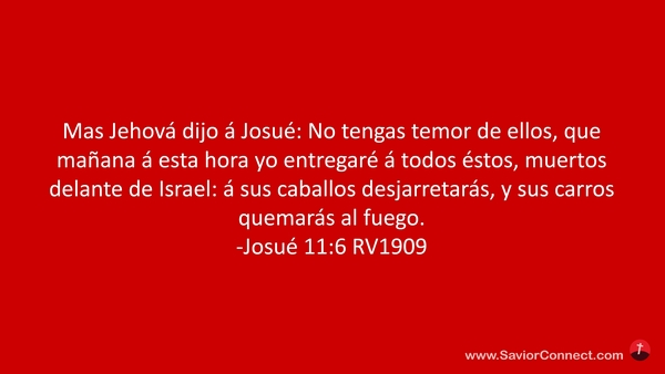 Mas Jehová dijo á Josué: No tengas temor de ellos, que mañana á esta hora yo entregaré á todos éstos, muertos delante de Israel: á sus caballos desjarretarás, y sus carros quemarás al fuego. -Josué 11:6 RV1909