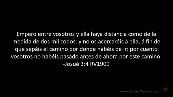 Empero entre vosotros y ella haya distancia como de la medida de dos mil codos: y no os acercaréis á ella, á fin de que sepáis el camino por donde habéis de ir: por cuanto vosotros no habéis pasado antes de ahora por este camino. -Josué 3:4 RV1909