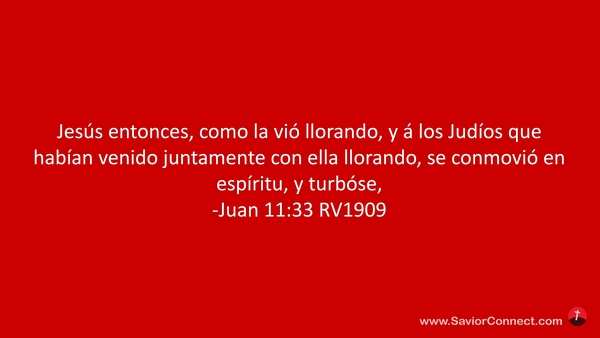 Jesús entonces, como la vió llorando, y á los Judíos que habían venido juntamente con ella llorando, se conmovió en espíritu, y turbóse, -Juan 11:33 RV1909