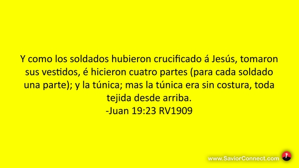 Y como los soldados hubieron crucificado á Jesús, tomaron sus vestidos, é hicieron cuatro partes (para cada soldado una parte); y la túnica; mas la túnica era sin costura, toda tejida desde arriba. -Juan 19:23 RV1909