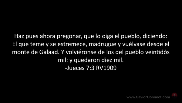 Haz pues ahora pregonar, que lo oiga el pueblo, diciendo: El que teme y se estremece, madrugue y vuélvase desde el monte de Galaad. Y volviéronse de los del pueblo veintidós mil: y quedaron diez mil. -Jueces 7:3 RV1909