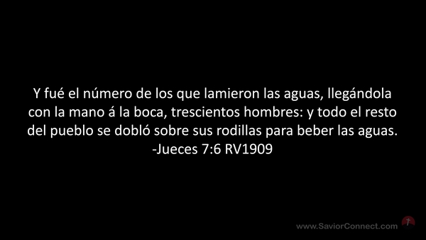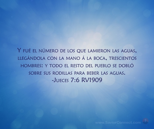 Y fué el número de los que lamieron las aguas, llegándola con la mano á la boca, trescientos hombres: y todo el resto del pueblo se dobló sobre sus rodillas para beber las aguas. -Jueces 7:6 RV1909