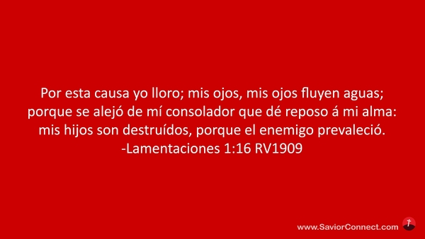 Por esta causa yo lloro; mis ojos, mis ojos fluyen aguas; porque se alejó de mí consolador que dé reposo á mi alma: mis hijos son destruídos, porque el enemigo prevaleció. -Lamentaciones 1:16 RV1909