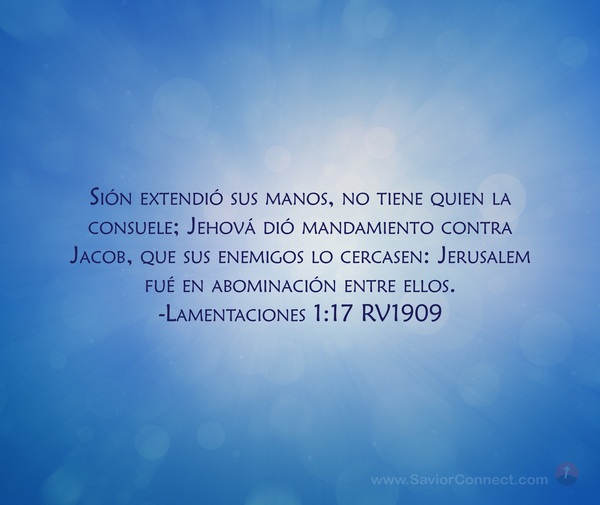 Sión extendió sus manos, no tiene quien la consuele; Jehová dió mandamiento contra Jacob, que sus enemigos lo cercasen: Jerusalem fué en abominación entre ellos. -Lamentaciones 1:17 RV1909